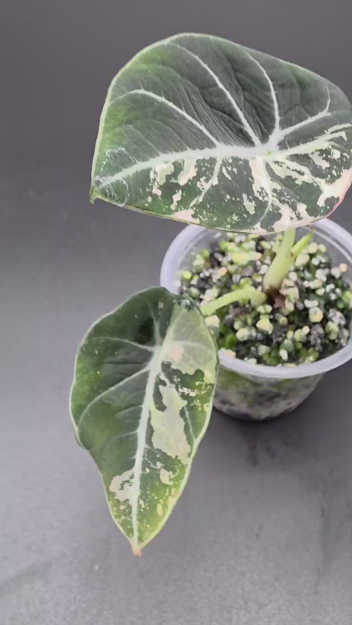 Alocasia Black Velvet Pink/Albo is an extremely rare variegated form of the classic Black Velvet, featuring thick, velvety charcoal leaves with striking pink, blush, or cream variegation. Each leaf shows unique marbling, splashes, or small albo patches — a mutation highly prized among jewel Alocasia collectors.