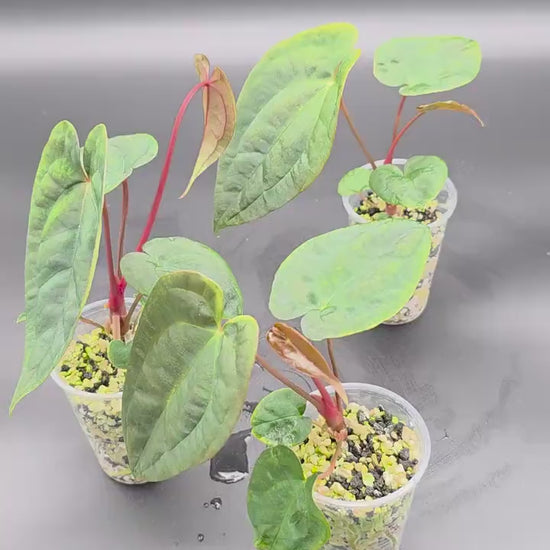 This stunning Anthurium papillilaminum ‘Red Stem' is prized for its velvety, deep green foliage and vivid reddish petioles that set it apart from the standard form. Our plants are acclimated from import and grown in a semi-hydro mix of 50% perlite & 50% Eco-Complete, making them strong, healthy, and easy to transition into your indoor setup.